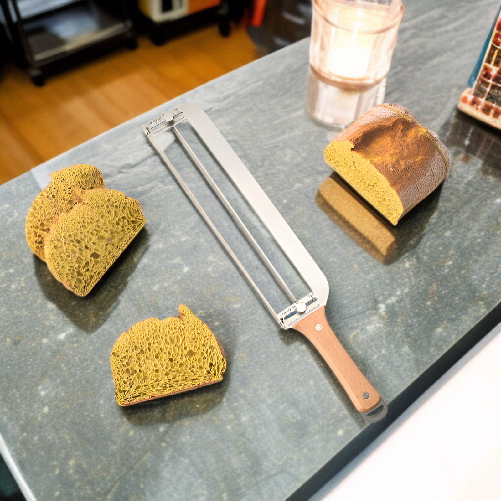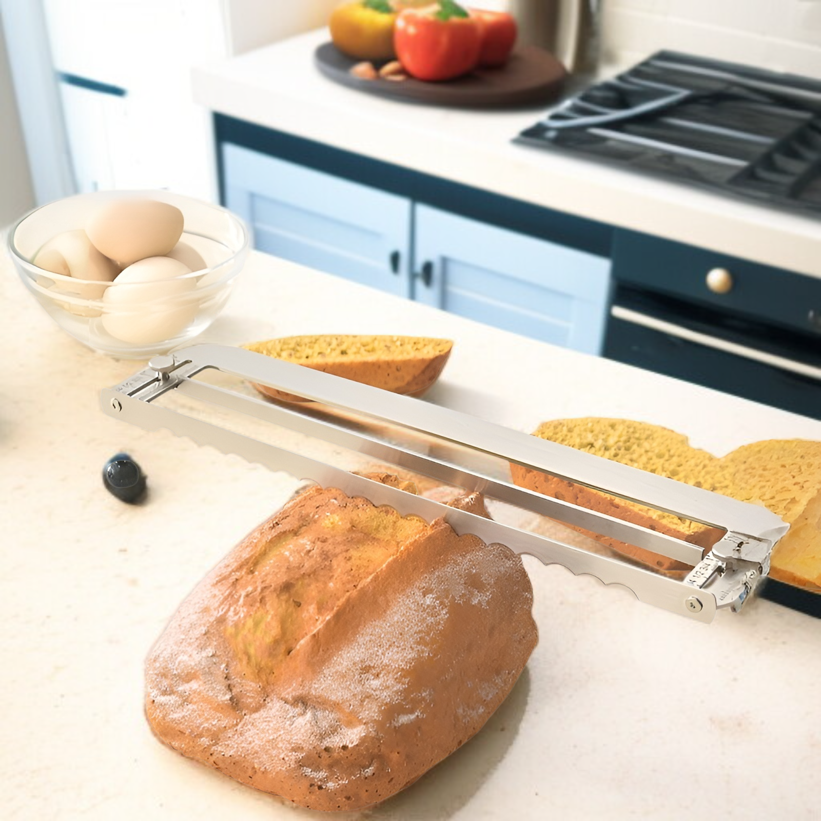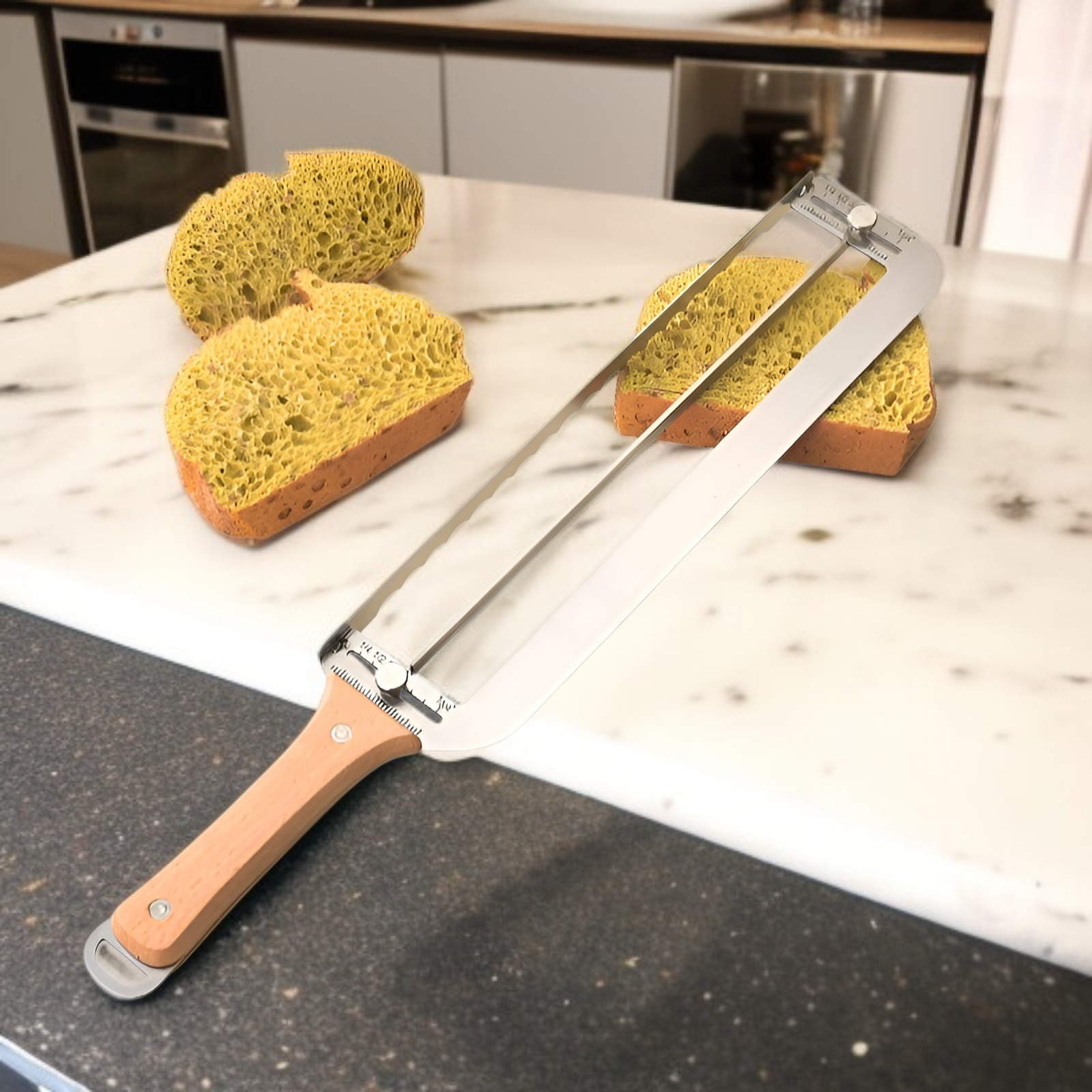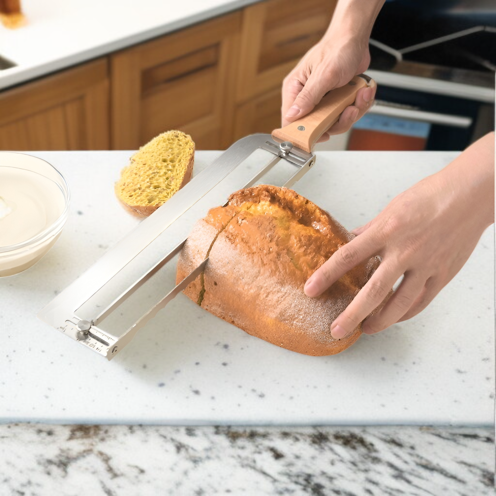 Edelstahl-Brot-Bogenmesser für präzises Schneiden, verstellbar für unterschiedliche Brotdicken, ideal für Hefebrot, langlebig und leicht zu reinigen, perfekt für den Hausgebrauch.
