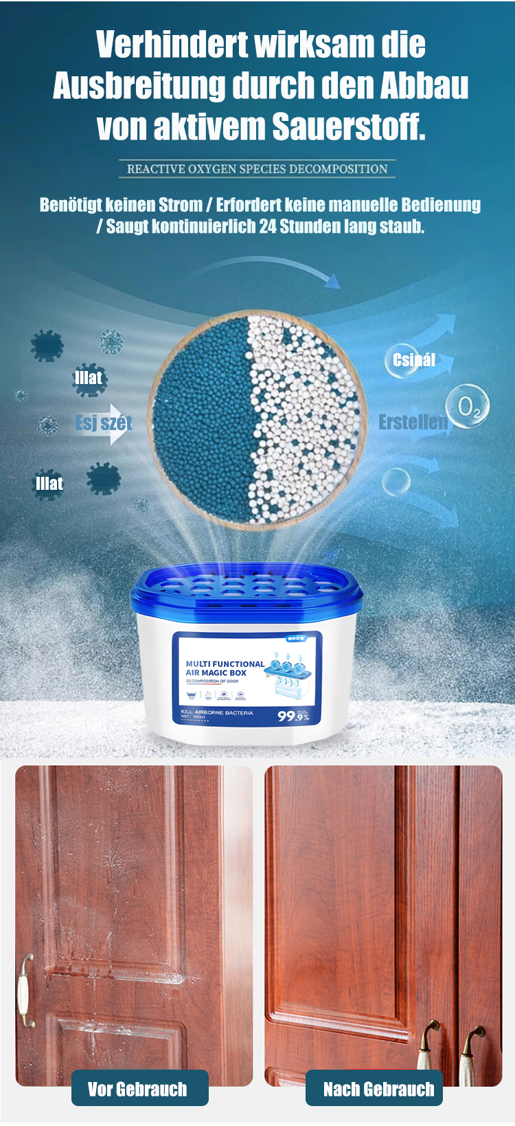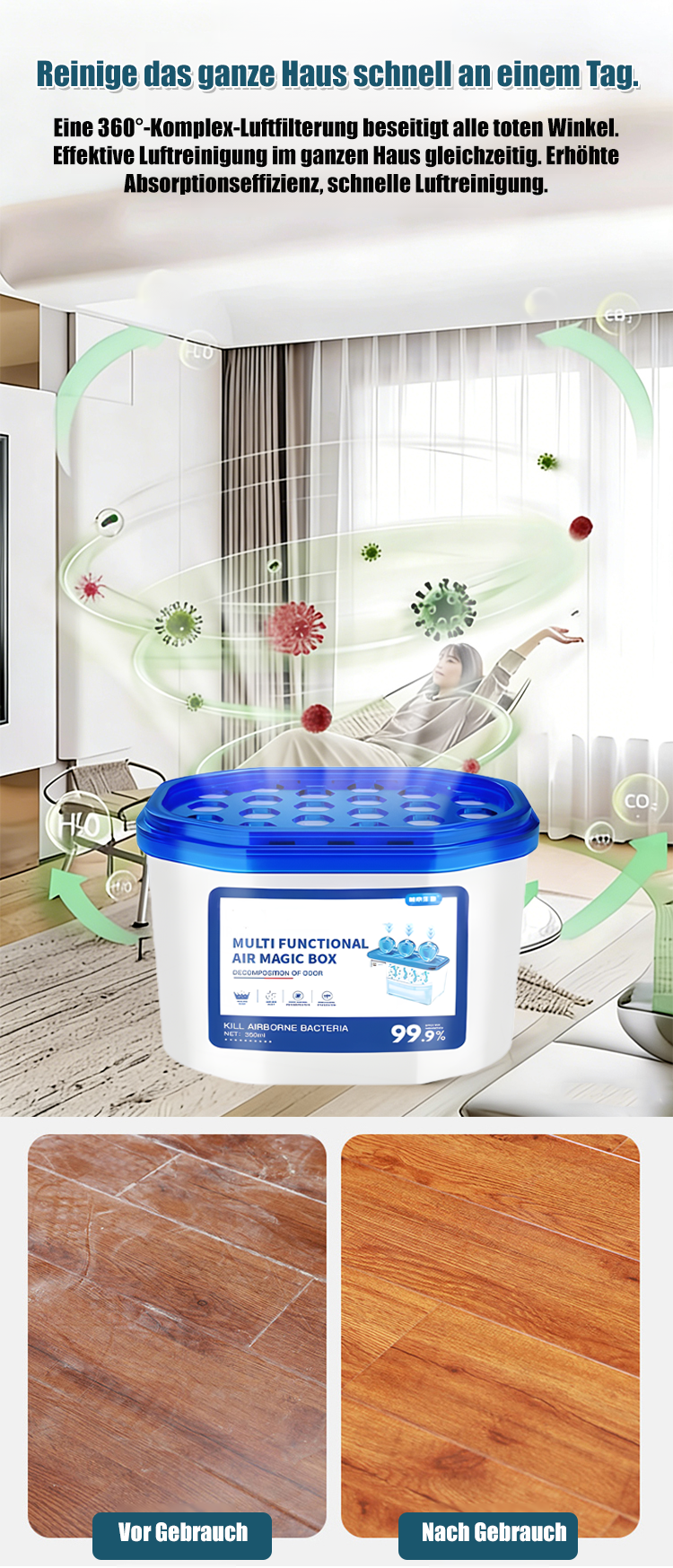Dieses Produkt bietet eine antibakterielle Wirkung von 99,9 %, beseitigt effektiv Gerüche und hemmt das Bakterienwachstum. Es sorgt für eine 360°-Rundumreinigung des gesamten Hauses und erledigt die Reinigung in nur einem Tag – das spart Ihnen Zeit und Mühe.
